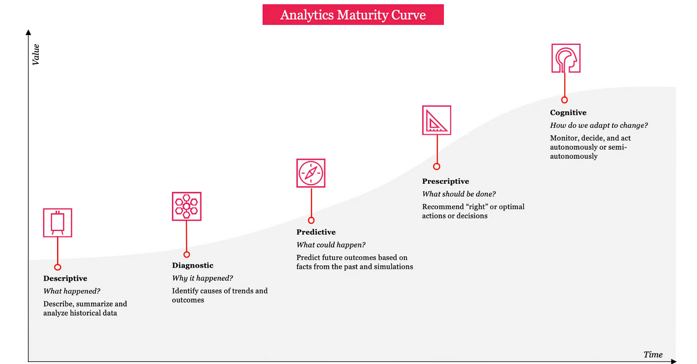 PricewaterhouseCooper, meanwhile, also has a useful version they call the "Analytics Maturity Curve". Here you get a sense for how the value of analytics specifically increases over time, as you collect more data and develop deeper capabilities at interpreting it. We highly recommend reading the linked articles for additional nuggets of data wisdom.